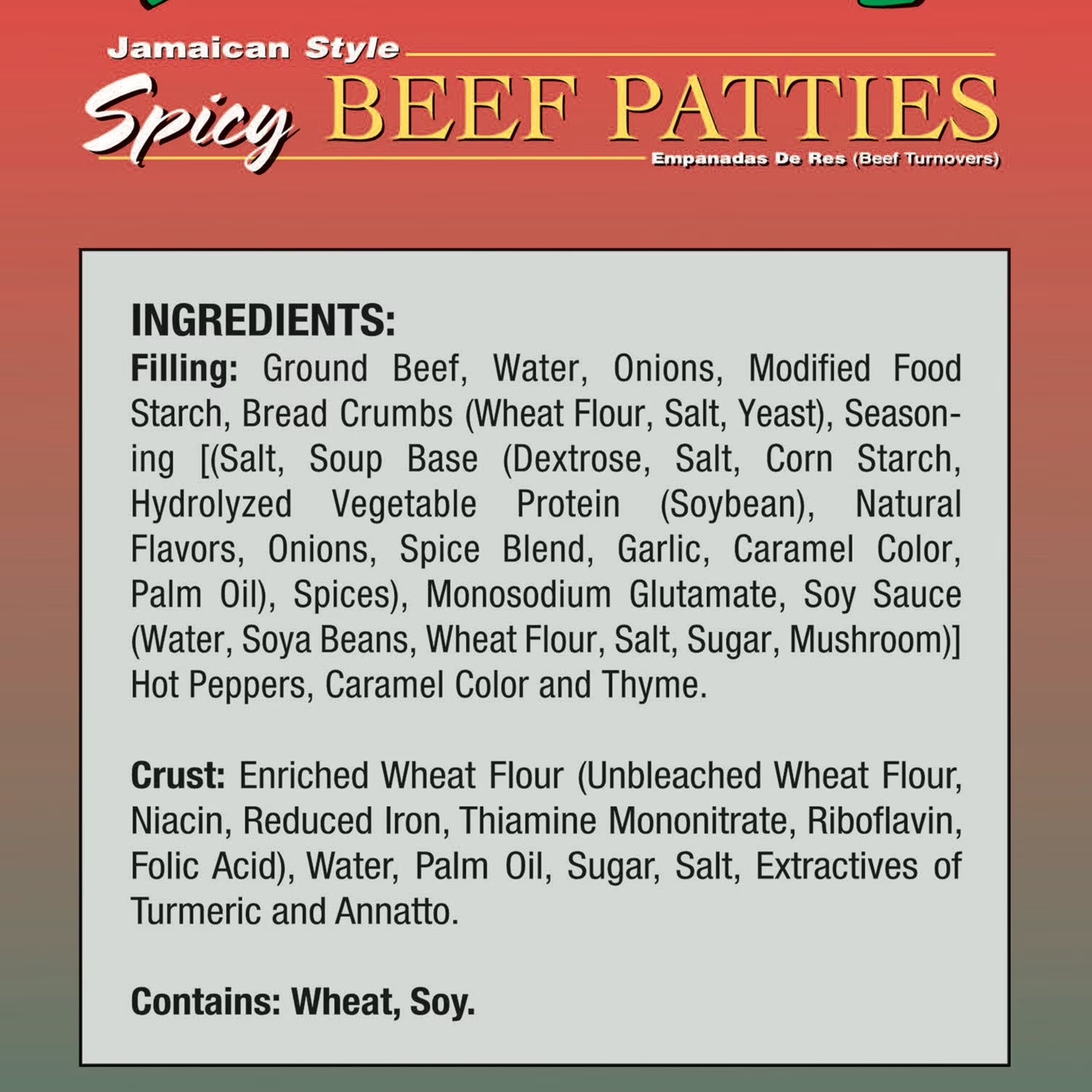 Filling: Ground beef, water, onions, modified food starch, bread crumbs (wheat flour, salt, yeast), seasoning [(salt, soup base (dextrose, salt, corn starch, hydrolyzed vegetable protein (soybean), natural flavors, onions, spice blend, garlic, caramel color, palm oil), flavoring), monosodium glutamate, soy sauce (water, soybeans, wheat, salt)], hot peppers, caramel color and thyme