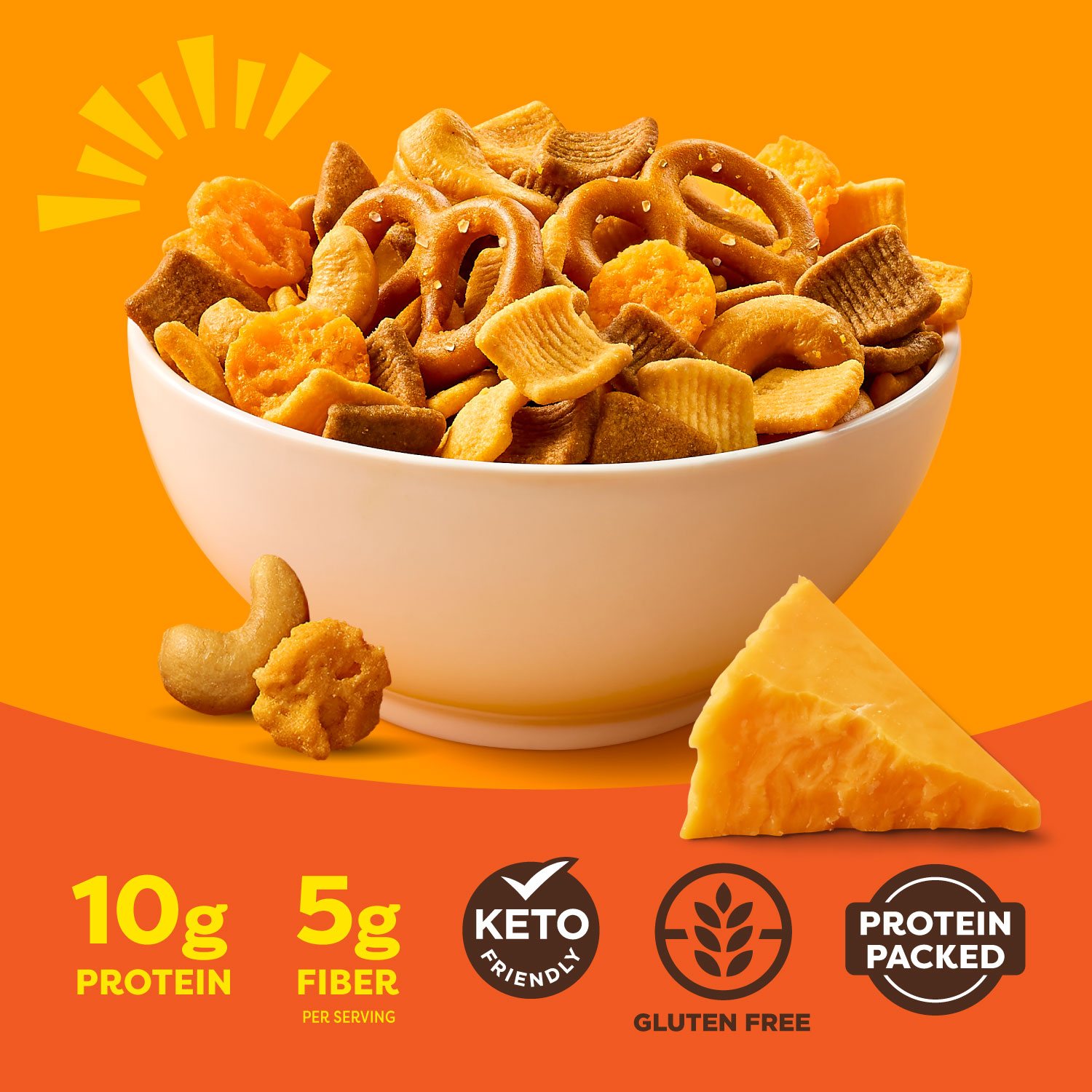 This snack mix is thoughtfully crafted to be lower in sugar while providing positive nutrition, including protein and fiber. It's a better-for-you option that doesn't compromise on taste, making it a satisfying choice for any time of day.