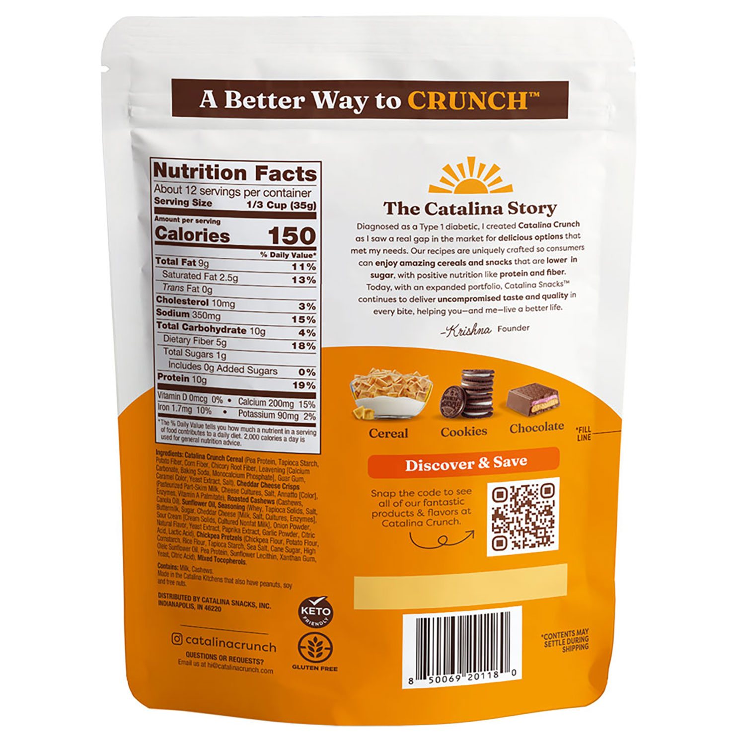 Designed for your busy lifestyle, the resealable pouch ensures freshness and makes it easy to enjoy this snack mix on the go. Whether you're at work, traveling, or relaxing at home, Catalina Crunch Cheddar Snack Mix is the perfect companion for happier snacking.