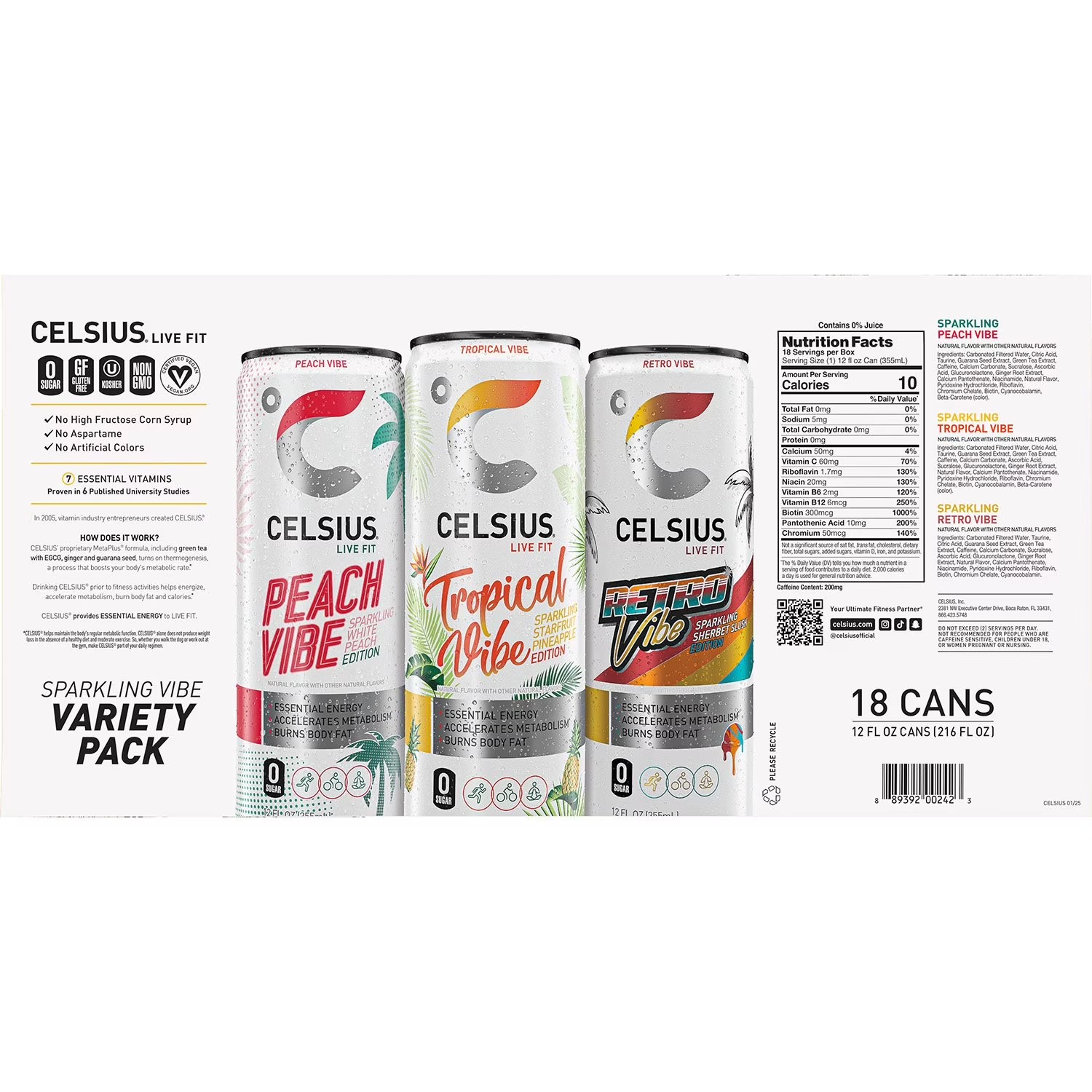 The CELSIUS® Sparkling Vibe Variety Pack includes six cans each of Sparkling Peach Vibe, Tropical Vibe, and Retro Vibe. Made with clinically proven ingredients, these carbonated flavors of CELSIUS® have the perfect balance of flavor and energy that serve as an awesome pick-me-up for active lifestyles. Make CELSIUS® your go-to choice for Essential Energy!