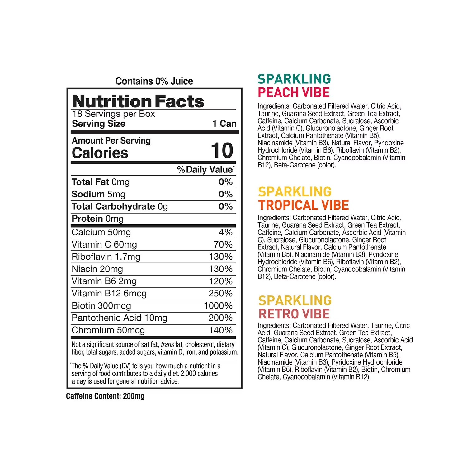 Tropical Vibe Ingredients: Carbonated Filtered Water, Citric Acid, Taurine, Guarana Seed Extract, Green Tea Extract, Caffeine, Calcium Carbonate, Ascorbic Acid, Sucralose, Glucuronolactone, Ginger Root Extract, Natural Flavor, Calcium Pantothenate, Niacinamide, Pyridoxine Hydrochloride, Riboflavin, Chromium Chelate, Biotin, Cyanocobalamin, Beta-Carotene (color).