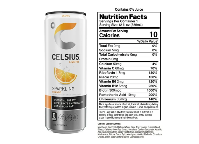CELSIUS is functional, Essential Energy, a better-for-you, premium alternative to traditional energy drinks. As a global, lifestyle fitness drink, CELSIUS was created to help people LIVE FIT, exceed their goals and elevate their everyday lives. Made with proven, premium ingredients, 7 Essential Vitamins and zero sugar, no artificial colors, no aspartame, no high fructose corn syrup and non-GMO. CELSIUS is vegan, gluten-free and Kosher. Our proprietary MetaPlus blend contains green tea extract with EGCG. It also includes guarana seed extract, ginger root for flavor and digestion, vitamin C to help support your immune system, vitamin B for energy production, and chromium to help control hunger, making it an ideal pre-workout drink. Stay active and dazzle your tastebuds with the juicy and citrusy sweet blend of refreshing oranges. Our take on a classic, but without all the sugar! Made with clinically proven ingredients, this carbonated flavor of CELSIUS has the perfect balance of flavor and energy that serves as an awesome pick-me-up for active lifestyles. Make CELSIUS your go to choice for Essential Energy! CELSIUS is available in 12 Fl Oz slim cans and sold in a 12-pack for convenience.