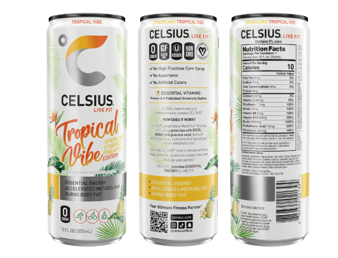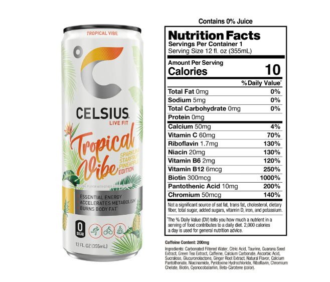 CELSIUS® Sparkling Tropical Vibe will take your tastebuds on a tropical vacation with the refreshingly exotic and sweet flavors of starfruit and pineapple. The sweet and sour fusion of flavor gives you island vibes in each sip