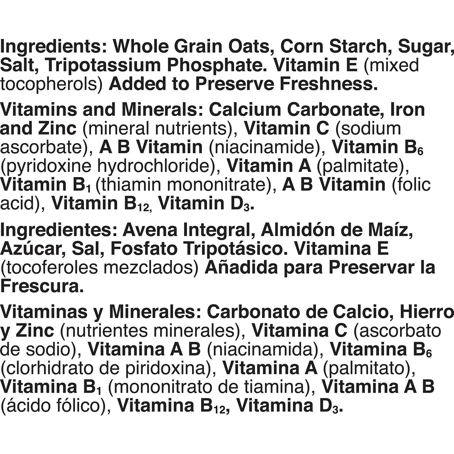 Ingredients: Whole Grain Oats, Corn Starch, Sugar, Salt, Tripotassium Phosphate. Vitamin E (mixed tocopherols) Added to Preserve Freshness. Vitamins and Minerals: Calcium Carbonate, Iron and Zinc (mineral nutrients), Vitamin C (sodium ascorbate), A B Vitamin (niacinamide), Vitamin B6 (pyridoxine hydrochloride), Vitamin A (palmitate), Vitamin B1 (thiamin mononitrate), A B Vitamin (folic acid), Vitamin B12, Vitamin D3.
