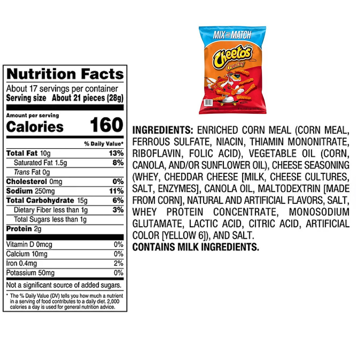 CHEETOS snacks are the much loved cheesy treats that are fun for everyone! You just can’t eat a CHEETOS snack without licking the signature “cheetle” off your fingertips, try it. And wherever the CHEETOS brand and CHESTER CHEETAH go, cheesy smiles are sure to follow. Bring a cheesy, delicious crunch to snack time with a bag of CHEETOS Crunchy Cheese-Flavored Snacks. Made with real cheese for maximum flavor. Great for sharing at parties or for enjoying for yourself.