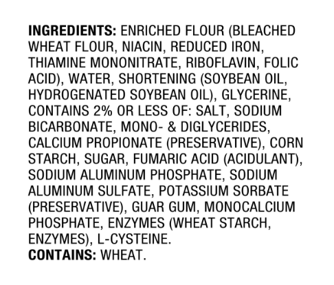 Enriched Flour (Bleached Wheat Flour, Niacin, Reduced Iron, Thiamine Mononitrate, Riboflavin, Folic Acid), Water, Shortening (Soybean Oil, Hydrogenated Soybean Oil), Glycerine, Contains 2% or less of: Salt, Sodium Bicarbonate, Mono- & Diglycerides, Calcium Propionate (Preservative), Corn Starch, Sugar, Fumaric Acid (Acidulant), Sodium Aluminum Phosphate, Sodium Aluminum Sulfate, Potassium Sorbate (Preservative), Guar Gum, Monocalcium Phosphate, Enzymes (Wheat Starch, Enzymes), L-Cysteine. Contains: Wheat. Produced in a facility that also processes: Soy.