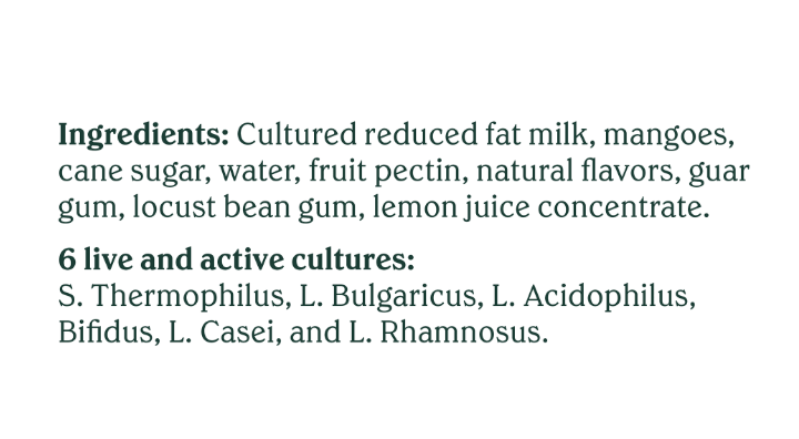 CULTURED REDUCED FAT MILK, MANGOES, CANE SUGAR, WATER, FRUIT PECTIN, NATURAL FLAVORS, GUAR GUM, LOCUST BEAN GUM, LEMON JUICE CONCENTRATE. CONTAINS LIVE AND ACTIVE CULTURES: S. THERMOPHILUS, L. BULGARICUS, L. ACIDOPHILUS, BIFIDUS, L. CASEI, AND L. RHAMNOSUS.