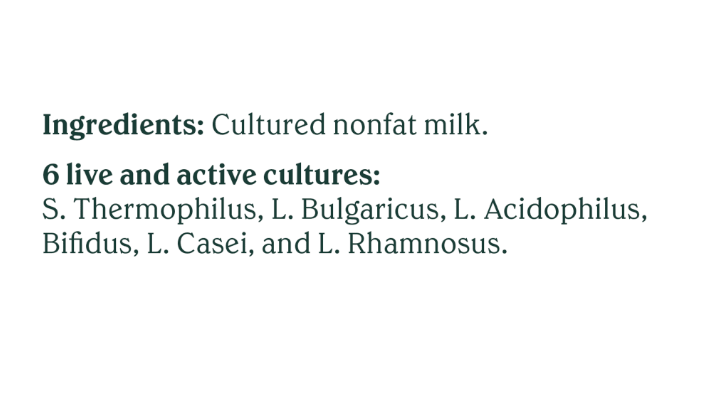 Ingredients: CULTURED NONFAT MILK. CONTAINS LIVE AND ACTIVE CULTURES: S. THERMOPHILUS, L. BULGARICUS, L. ACIDOPHILUS, BIFIDUS, L. CASEI, AND L. RHAMNOSUS.