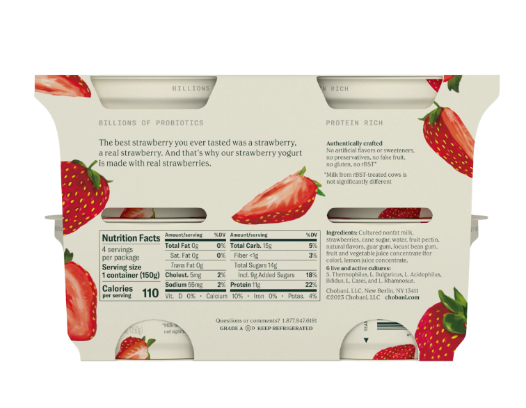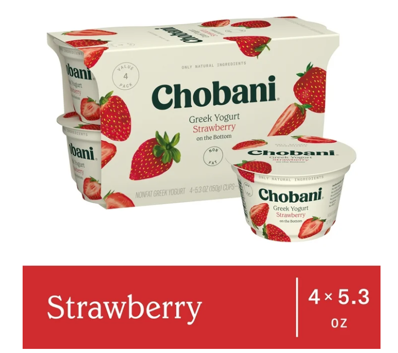 - 4-5.3 oz cups of Chobani Non-Fat Strawberry on the Bottom Greek Yogurt