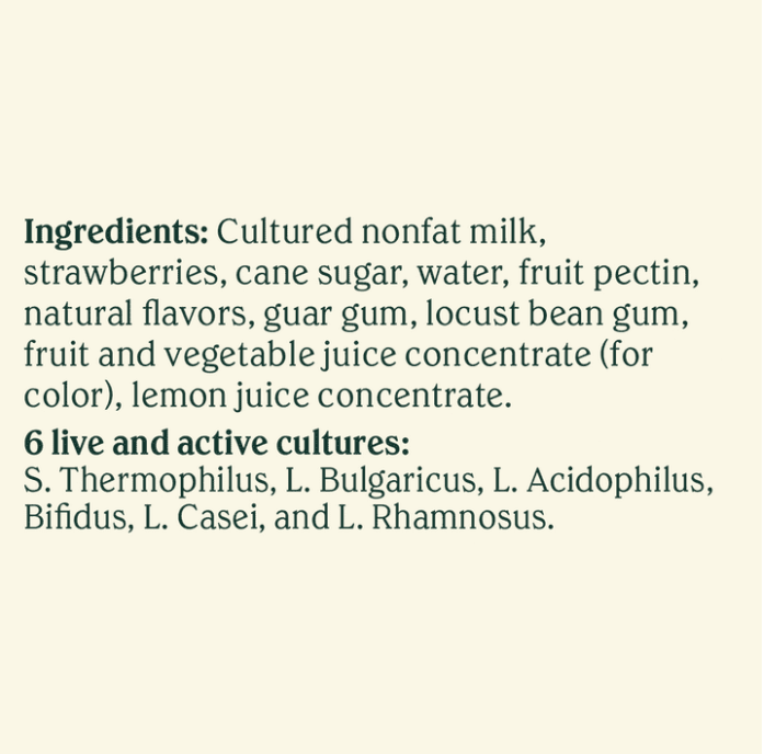 Nonfat Yogurt (Cultured Pasteurized Nonfat Milk, Live and Active Cultures: S. Thermophilus, L. Bulgaricus, L. Acidophilus, Bifidus and L. Casei), Strawberries, Evaporated Cane Juice, Pectin, Natural Flavors, Locust Bean Gum, Fruit and Vegetable Juice Concentrate (For Color).