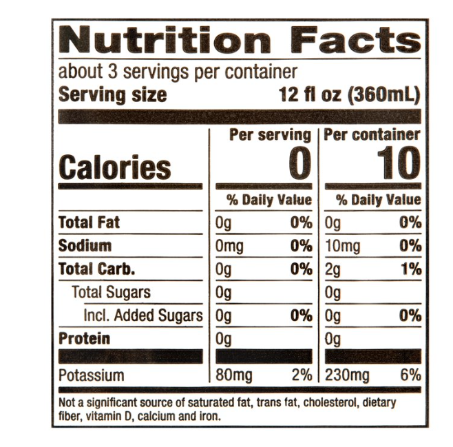 CARBONATED WATER, CITRIC ACID, NATURAL FLAVOR, ASPARTAME, POTASSIUM BENZOATE (PRESERVATIVE), POTASSIUM CITRATE, ACESULFAME POTASSIUM.