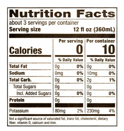 CARBONATED WATER, NATURAL FLAVOR, CITRIC ACID, MALIC ACID, POTASSIUM BENZOATE (PRESERVATIVE), ASPARTAME, POTASSIUM CITRATE, ACESULFAME POTASSIUM.