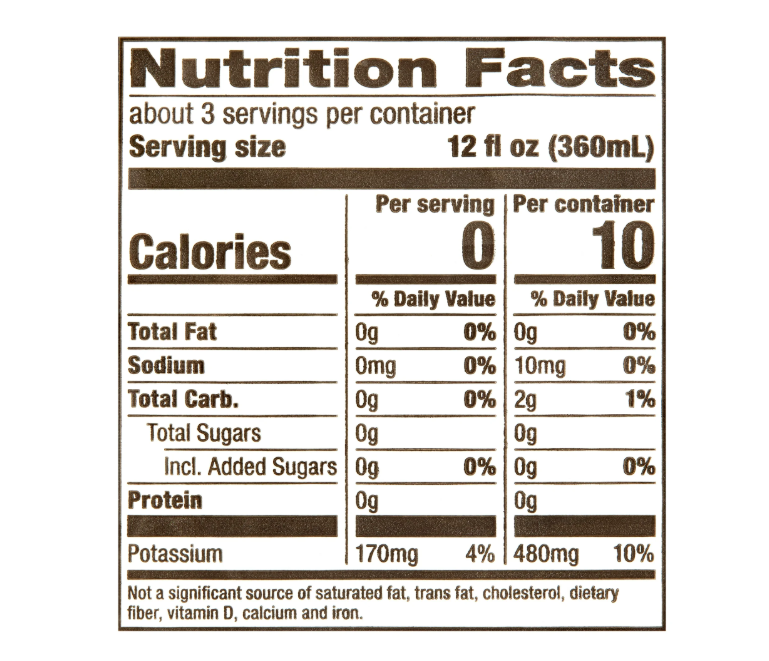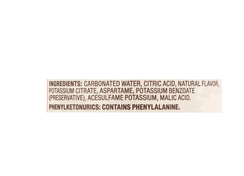 CARBONATED WATER, CITRIC ACID, NATURAL FLAVOR, POTASSIUM CITRATE, ASPARTAME, POTASSIUM BENZOATE (PRESERVATIVE), ACESULFAME POTASSIUM, MALIC ACID. PHENYLKETONURICS: CONTAINS PHENYLALANINE.