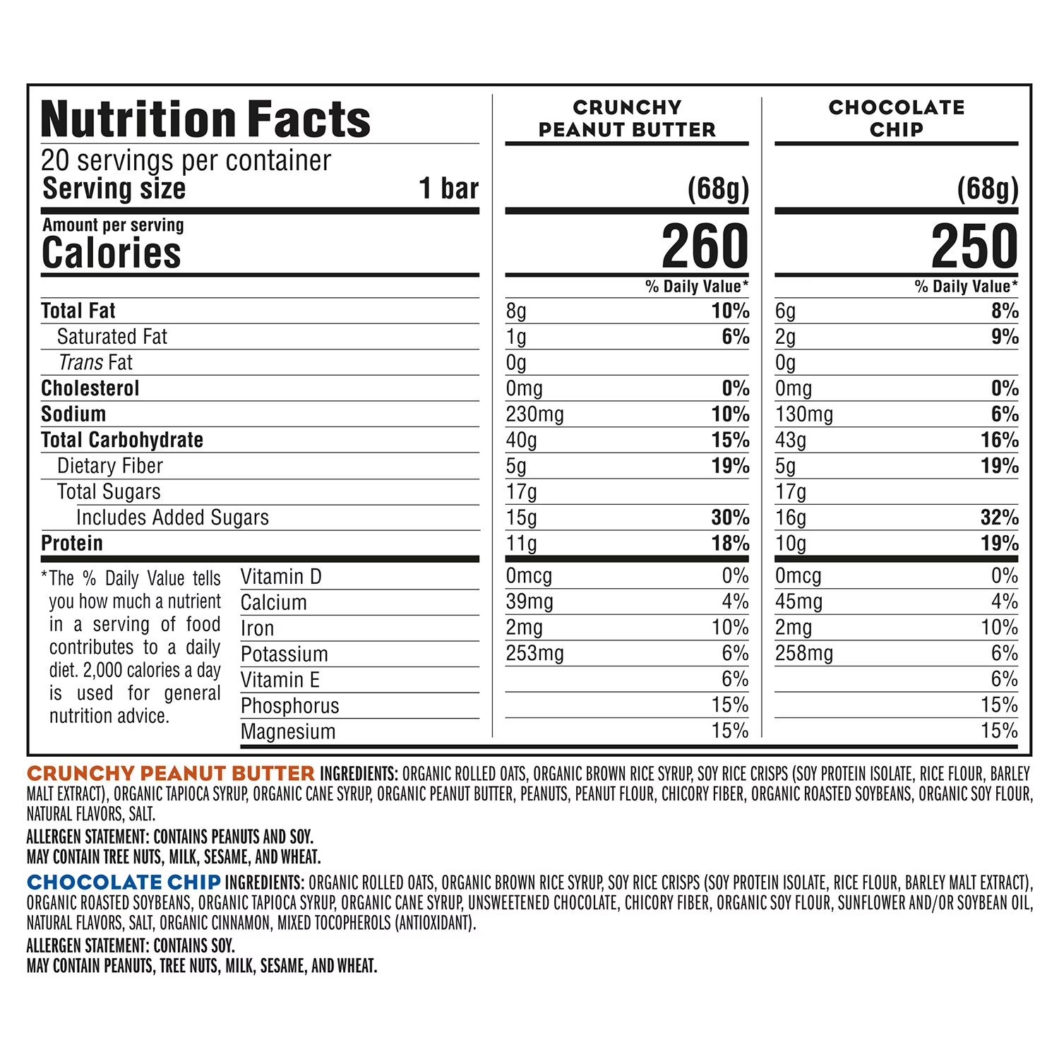 Includes: 20 bars, 2.4 oz. each 10 Crunchy Peanut Butter and 10 Chocolate Chip
