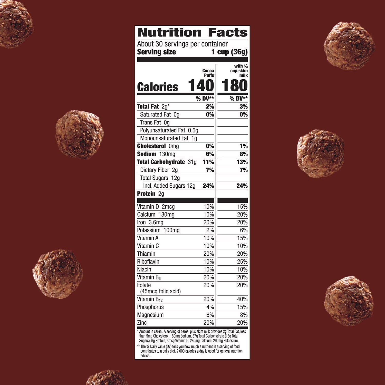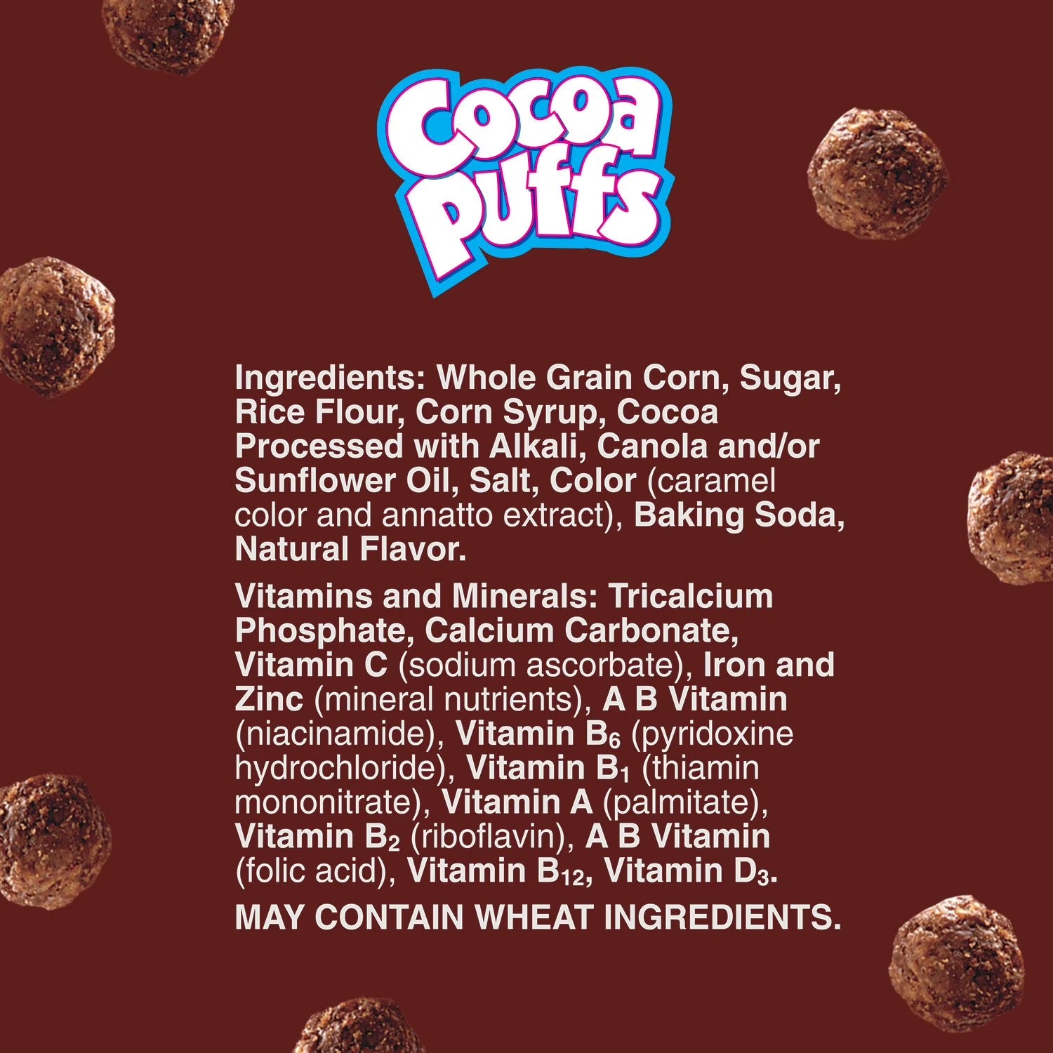 Ingredients: Whole Grain Corn, Sugar, Rice Flour, Corn Syrup, Cocoa Processed with Alkali, Canola and/or Sunflower Oil, Salt, Color (caramel color and annatto extract), Baking Soda, Natural Flavor. Vitamins and Minerals: Tricalcium Phosphate, Calcium Carbonate, Vitamin C (sodium ascorbate), Iron and Zinc (mineral nutrients), A B Vitamin (niacinamide), Vitamin B6 (pyridoxine hydrochloride), Vitamin B1 (thiamin mononitrate), Vitamin A (palmitate), Vitamin B2 (riboflavin), A B Vitamin (folic acid), Vitamin B12, Vitamin D3.
