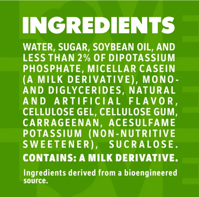 WATER, SUGAR, SOYBEAN OIL, AND LESS THAN 2% OF DIPOTASSIUM PHOSPHATE, MICELLAR CASEIN (A MILK DERIVATIVE), MONO- AND DIGLYCERIDES, NATURAL AND ARTIFICIAL FLAVOR, CELLULOSE GEL, CELLULOSE GUM, CARRAGEENAN, ACESULFAME POTASSIUM (NON-NUTRITIVE SWEETENER), SUCRALOSE.