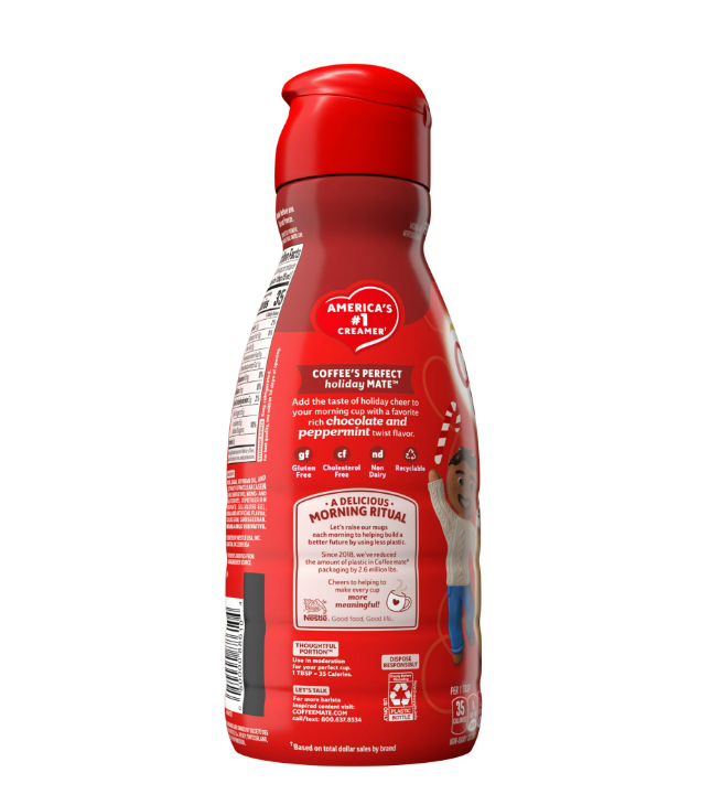 It’s time to make your coffee breaks iconic with Coffee mate Peppermint Mocha Flavored Coffee Creamer. You’re going to fall in love with our liquid coffee creamer, taking you from your early morning grind to your late-night fuel up with up to sixty-three 1 tbsp servings. We’re here for your coffee mug, your iced coffee glass and your midnight martini. Dietary preferences? We have those covered too – Our Coffee mate liquid creamer is non-dairy, cholesterol-free, and gluten-free. We really like coffee, just as much as we like our recyclable packaging. Keep your Peppermint Mocha flavored creamer cool in the fridge for up to 14 days (if you don’t finish it right away). Ready to level up your coffee game with our Peppermint Mocha flavored creamer yet?