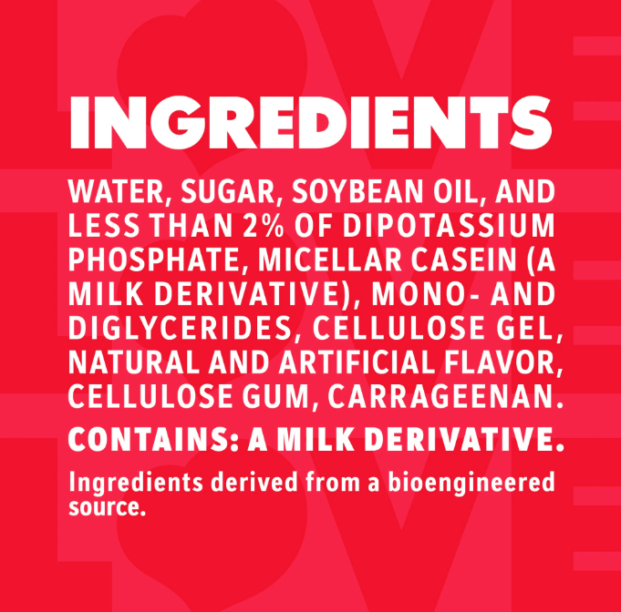 WATER, SUGAR, SOYBEAN OIL, AND LESS THAN 2% OF MICELLAR CASEIN (A MILK DERIVATIVE), MONO- AND DIGLYCERIDES, DIPOTASSIUM PHOSPHATE, CELLULOSE GEL, NATURAL AND ARTIFICIAL FLAVOR, CELLULOSE GUM, CARRAGEENAN.