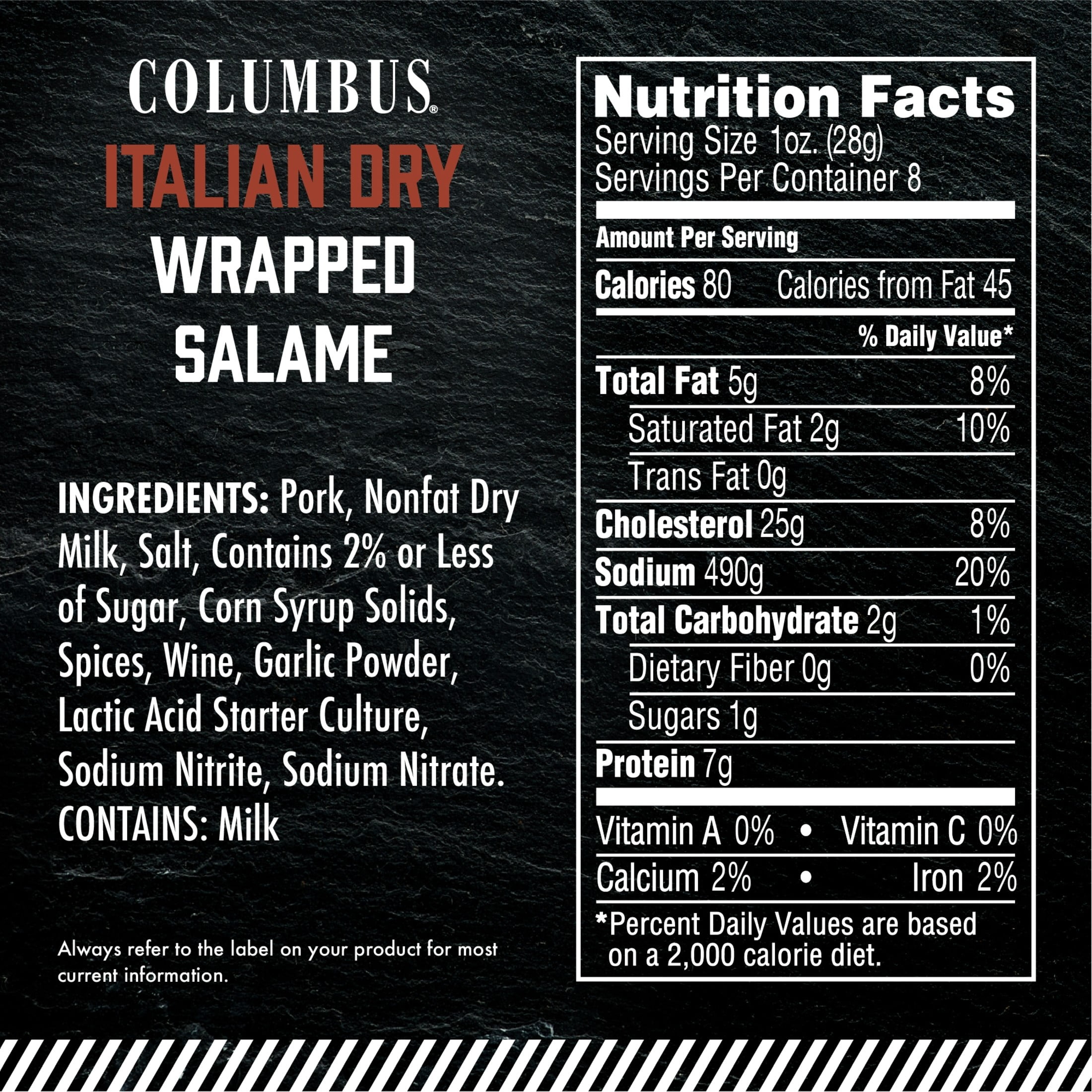 COLUMBUS Italian Dry Salame Stick is made from select cuts of pork, cracked black pepper, burgundy wine, and our signature blend of spices giving it a wonderful flavor. It is slow cured for a unique richness and aroma. Pairs well with cheddar, Grana Padano, mozzarella, or Monterey Jack. Enjoy it with a glass of pinot noir, pilsner, or pale ale. This salame also goes great with Castelvetrano olives, marcona almonds, or hummus. COLUMBUS is a trademark of Columbus Manufacturing, Inc. ©2021 Columbus Manufacturing, Inc. All images are owned by Columbus Manufacturing, Inc.