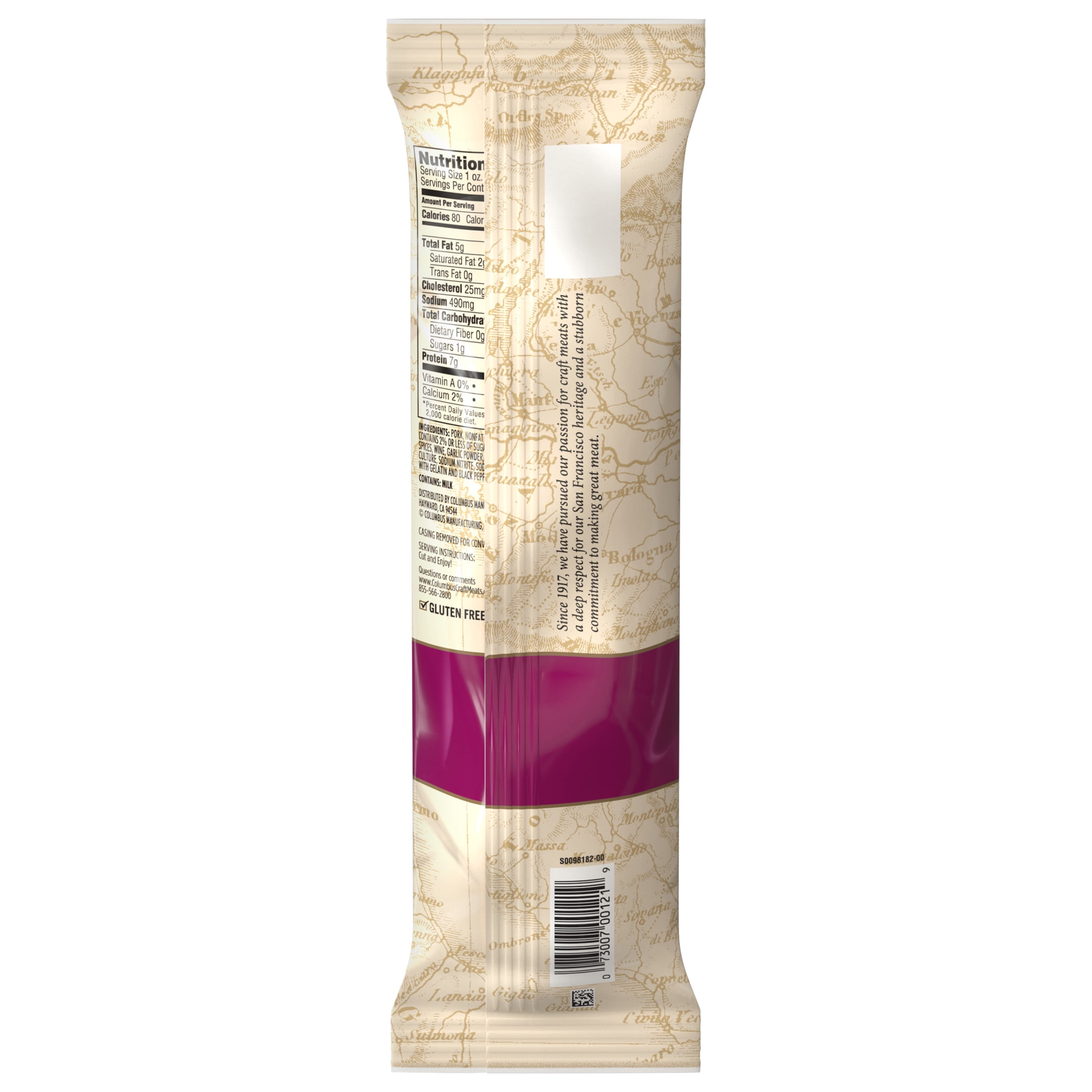 Ingredients: Pork, Nonfat Dry Milk, Salt, Contains 2% or less of Sugar, Corn Syrup Solids, Spices, Wine, Garlic Powder, Lactic Acid Starter Culture, Sodium Nitrite, Sodium Nitrate. Coated with Gelatin, Black Pepper. Contains: Milk.