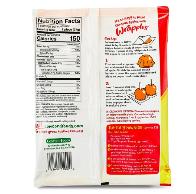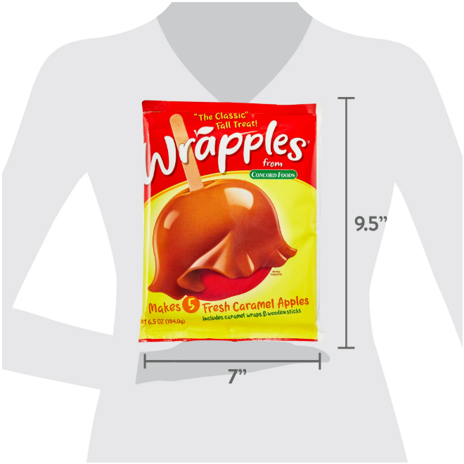Concord Foods The Original Caramel Apple Wrap - 5 CT. Concord Foods The Original Caramel Apple Wrap®. Fun for every one. Makes 5 fresh caramel apples. NET WT 6.5 OZ (184g).With Halloween parties and fall get-togethers at a peak September through December, the Wrapples® will be a great resource for entertaining during fall festivities. Each kit can make five caramel apples and includes caramel wrappers and wooden sticks.