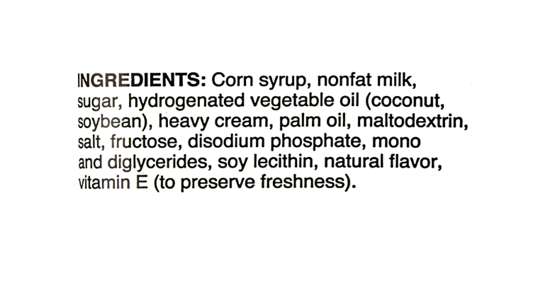 Corn syrup, nonfat milk, sugar, hydrogenated vegetable oil (coconut, soybean), heavy cream, palm oil, maltodextrin, salt, fructose, disodium phosphate, mono and diglycerides, soy lecithin, natural flavor, vitamin E (to preserve freshness).