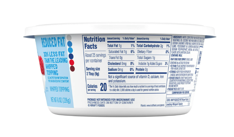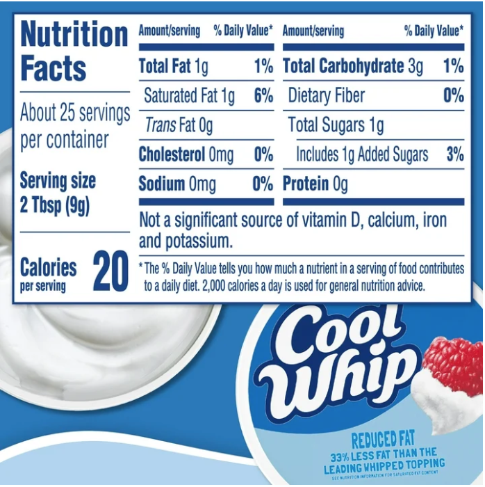 Cool and creamy, delicious and dreamy, Cool Whip Reduced Fat Whipped Topping is the dollop that makes desserts extra special. With 33% less fat than the leading whipped topping, our Reduced Fat Cool Whip is the same tasty delight you love, just with less fat. So light and fluffy, it adds a cloud of perfection to everything from pies to ice cream sundaes. Cool Whip is a one-of-a-kind creamy whipped topping. Consider it your guilt-free go-to. Add to your favorite dessert creations like banana pudding, strawberry shortcakes or parfaits. Put the playful topping on your hot chocolate and milkshakes, use as a dip for fresh fruit and more. The possibilities are endless! Each serving contains 20 calories and 1 gram of fat. Keep our frozen whipped topping in the freezer until ready to thaw and enjoy. Our 8-ounce tub of Cool Whip Reduced Fat Whipped Topping stays Fridge Fresh for two weeks. Just dollop and enjoy!