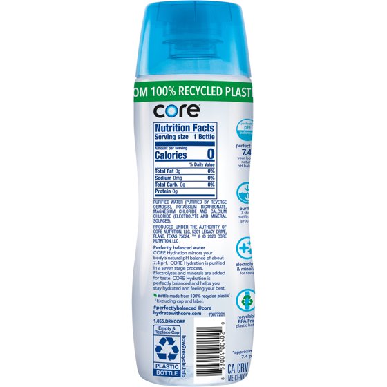 Core Hydration, Perfectly Balanced Water, Perfect 7.4 Natural pH, Purified With Electrolytes and Minerals, Cup Cap For Sharing, 20 Fl Oz Bottle