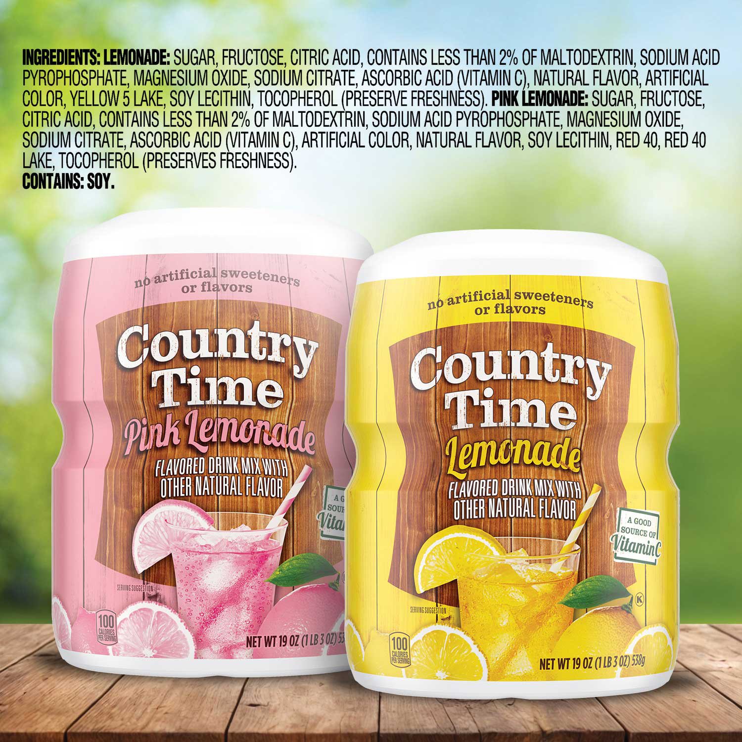 Ingredients: Lemonade: Sugar, Fructose, Citric Acid, Contains Less Than 2% Of Maltodextrin, Sodium Acid Pyrophosphate, Magnesium Oxide, Sodium Citrate, Ascorbic Acid (Vitamin C), Natural Flavor, Artificial Color, Yellow 5 Lake, Soy Lecithin, Tocopherol (Preserve Freshness). Pink Lemonade: Sugar, Fructose, Citric Acid, Contains Less Than 2% Of Maltodextrin, Sodium Acid Pyrophosphate, Magnesium Oxide, Sodium Citrate, Ascorbic Acid (Vitamin C), Artificial Color, Natural Flavor, Soy Lecithin, Red 40, Red 40 Lake, Tocopherol (Preserves Freshness). Contains: Soy.