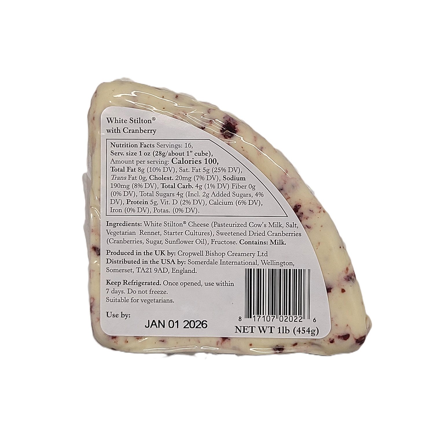 White Stilton Cheese (Paseurized Cow's Milk, Salt, Vegetarian Rennet, Starter Cultures), Sweetened Dried Cranberries (Cranberries, Sugar, Sunflower Oil), Fructose
