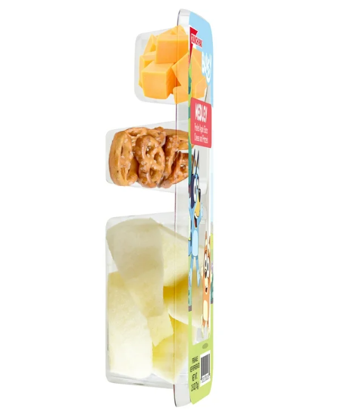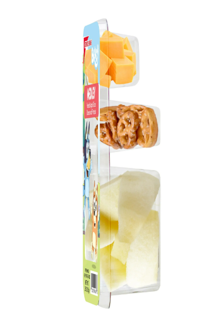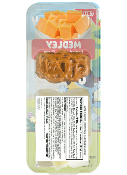 When it comes to healthy snacking, the Heelers do it best! This snack tray comes with Bluey-licious flavors with Fresh Sweet Sliced & Peeled Apples, Pretzels, and Cheddar Cheese. This snack tray is a great option and perfectly portioned for any occasion snacking and on-the-go adventure. Dive into a assortment of flavors with the perfect pairings of crowd-pleasing snack components - peeled apple slices, pretzels, and cheddar cheese in a 2.5oz tray . Kids will love unpacking their lunch at school and seeing their favorite Bluey characters, Bluey & Bingo! A good source of vitamin C and calcium. Each serving has only 110 calories. Keep refrigerated until ready to enjoy. School lunches just got a lot more fun with the Bluey Heelers & Crunch Pak!
