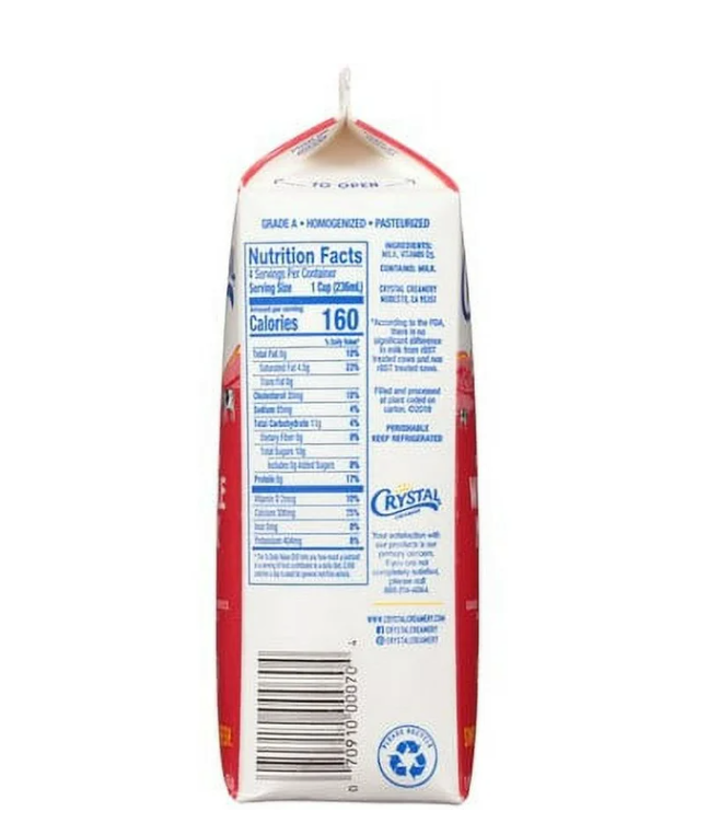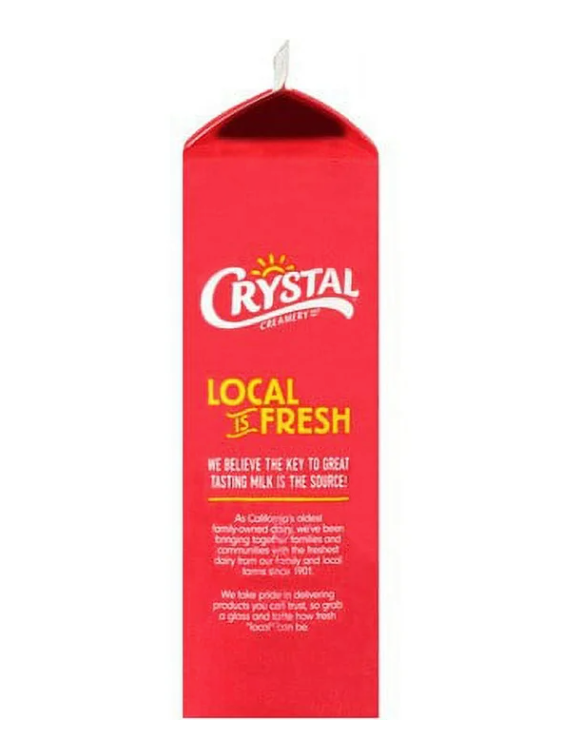 Crystal Creamery 100% California Whole Milk Vitamin D Paper Carton Quart, 32 fl oz (Refrigerated)