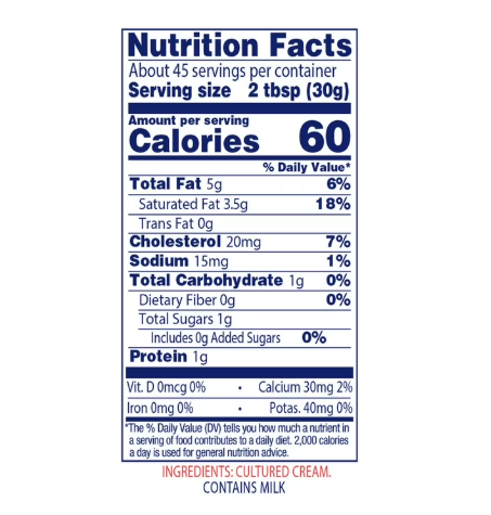 Daisy sour cream contains just one ingredient: Grade A cultured cream. It's made without any artificial colors, flavors or preservatives, contains no trans fat and is remarkably low in carbohydrates, sodium or sugar. Just two tablespoons contain only 60 calories. It's also certified kosher, so everyone can enjoy the amazing taste of Daisy cream.