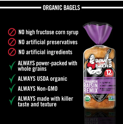 Dave's Killer Bread® Cinnamon Raisin Remix® Organic Bagels are shelf-stable USDA organic cinnamon raisin bagels with killer taste and hearty texture to mix up your morning routine. With 12g protein and 11g whole grains per bagel, these sweet and cinnamony organic whole grain bagels have no high-fructose corn syrup and no artificial ingredients. You can trust Dave's Killer Bread® to deliver killer taste, texture and whole grain nutrition. Cinnamon Raisin Remix® 5 Ct bagels are pre-sliced and ready to be slathered in smooth cream cheese or butter. Or you can stack up the goods for a bagel breakfast sandwich. Just open up a breakfast bagel and you're on your way to a cinnamon raisin bread sandwich. Remix for your morning with Dave's Killer Bread® Cinnamon Raisin Remix® bagels. The story of Dave's Killer Bread® began at the Portland Farmers Market, when Dave Dahl and his nephew brought some loaves of Dave's bread to sell. For Dave, this marked the beginning of a new chapter in his life. Though he grew up in a family of bakers, his life took a different path. A path that landed him in prison for 15 years. Determined to prove his worth and make a positive impact, Dave worked tirelessly to bake breads that tasted unlike anything else on the market—packed with seeds and grains, made with only the very best organic and Non-GMO Project Verified ingredients. Dave's Killer Bread® believes everyone is capable of greatness. One in three of the company's employee partners at their Milwaukie, OR, bakery has a criminal background—but your past doesn't define your future. As a proud Second Chance Employer, Dave’s Killer Bread® truly believes everyone deserves a second chance to become a Good Seed.