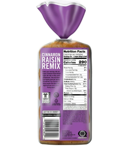 Organic Wheat (Organic Wheat Flour, Organic Whole Wheat Flour), Water, Organic Raisins, Organic Wheat Gluten, Organic Rolled Oats, Organic Cinnamon Bits (Organic Cane Sugar, Organic Wheat Flour, Organic Cinnamon, Organic Sunflower Oil), Organic Cinnamon Swirl Blend (Organic Cane Sugar, Organic Wheat Flour, Organic Cinnamon), Organic Cane Sugar, Contains 2% or Less of Each of the Following: Yeast, Organic Expeller Pressed Canola Oil, Organic Molasses, Organic Yellow Cornmeal, Salt, Organic Fermented Rye Flour, Organic Vinegar, Organic Cultured Wheat Flour, Organic Sesame Flour, Organic Acerola Cherry Powder, Enzymes.