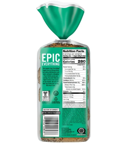 Organic Wheat (Organic Whole Wheat Flour, Organic Wheat Flour), Water, Organic Epic Everything Seed and Topping Mix (Organic Chia Seeds, Organic Whole Flax Seeds, Organic Poppy Seeds, Organic Tri-Color Quinoa, Organic Sunflower Seeds, Coarse Sea Salt, Organic Dried Minced Garlic, Organic Dried Chopped Onion), Organic Wheat Gluten, Organic Cane Sugar, Organic Rolled Oats, Contains 2% or Less of Each of the Following: Organic Vinegar, Organic Expeller Pressed Canola Oil, Yeast, Organic Yellow Cornmeal, Organic Cultured Wheat Flour, Salt, Organic Fermented Rye Flour, Organic Sesame Flour, Enzymes, Organic Acerola Cherry Powder, Natural Flavor, Organic Natural Flavor, Organic Garlic Oil. 798-032725.