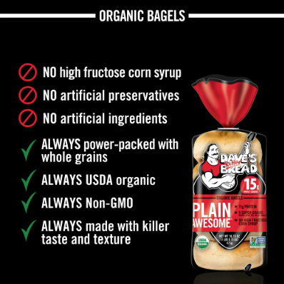 Dave's Killer Bread® Plain Awesome® Bagels are USDA organic and Non-GMO Project Verified, making them a just plain awesome way to start your day. 15g whole grains and 10g of protein per serving. These shelf-stable soft and delicious plain organic bagels are baked with five super grains, including organic quinoa, spelt, rye, millet and barley—not to mention no high-fructose corn syrup, no artificial preservatives and no artificial ingredients. You can trust Dave's Killer Bread® to deliver killer taste, texture and whole grain nutrition. Plain Awesome® bagels are pre-sliced and just what you need for easy mornings, hearty breakfast sandwiches and meals on the go. The story of Dave’s Killer Bread® began at the Portland Farmers Market, when Dave Dahl and his nephew brought some loaves of Dave's bread to sell. For Dave, this marked the beginning of a new chapter in his life. Though he grew up in a family of bakers, his life took a different path. A path that landed him in prison for 15 years. Determined to prove his worth and make a positive impact, Dave worked tirelessly to bake breads that tasted unlike anything else on the market — packed with seeds and grains, made with only the very best organic and Non-GMO Project Verified ingredients. Dave’s Killer Bread® believes everyone is capable of greatness. One in three of the company's employee partners at their Milwaukie, OR bakery has a criminal background—but your past doesn't define your future. As a proud Second Chance Employer, Dave’s Killer Bread® truly believes everyone deserves a second chance to become a Good Seed.
