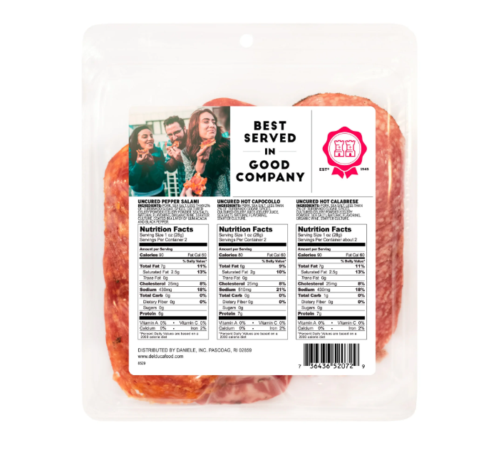 PEPPER SALAME: Pork, Sea Salt, less than 2% of : Dextrose, Spices, Wine, Natural Flavoring, Sodium Erythorbate, Sodium Nitrate, Sodium Nitrite, Starter Culture, Coated in a layer of Gum Acacia and Black Pepper. HOT CAPOCOLLO: Pork, Salt, less than 2% of : Dextrose, Spices, Starter Culture, Sodium Erythorbate, Natural Flavoring, Sodium Nitrate, Sodium Nitrite. HOT CALABRESE: Pork, Sea Salt, less than 2% of: Dextrose, Starter Culture, Natural Flavoring, Sodium Erythorbate, Sodium Nitrate, Sodium Nitrite, Spices, Wine. DANIELE, INC. PASCOAG RI