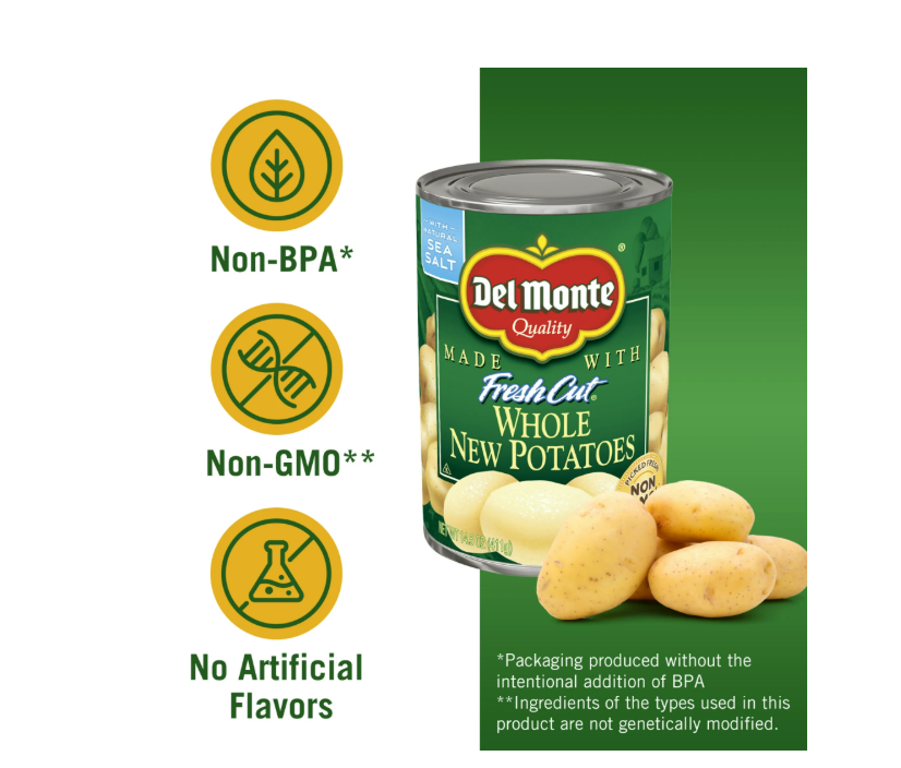Del Monte Canned Potatoes are non-GMO and packed in non-BPA lined cans