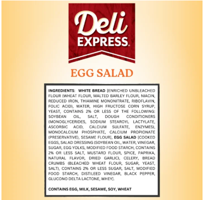 WHITE BREAD [ENRICHED UNBLEACHED FLOUR (WHEAT FLOUR, MALTED BARLEY FLOUR, NIACIN, REDUCED IRON, THIAMINE MONONITRATE, RIBOFLAVIN, FOLIC ACID), WATER, HIGH FRUCTOSE CORN SYRUP, YEAST, CONTAINS 2% OR LESS OF SOYBEAN OIL, SALT, DOUGH CONDITIONERS (MONOGLYCERIDES, SODIUM STEAROYL LACTYLATE, ASCORBIC ACID, CALCIUM SULFATE, ENZYMES), MONOCALCIUM PHOSPHATE, CALCIUM PROPIONATE (PRESERVATIVE)], EGG SALAD [COOKED EGGS, SALAD DRESSING (SOYBEAN OIL, WATER, VINEGAR, SUGAR, EGG YOLKS, MODIFIED FOOD STARCH, SALT, MUSTARD FLOUR, SPICE, PAPRIKA, NATURAL FLAVOR, DRIED GARLIC), CELERY, BREAD CRUMBS (BLEACHED WHEAT FLOUR, SUGAR, YEAST, SALT), CONTAINS 2% OR LESS SUGAR, SALT, DISTILLED VINEGAR, MODIFIED FOOD STARCH, GLUCONO DELTA LACTONE, BLACK PEPPER, GUM ARABIC, WHEY]. CONTAINS EGG, MILK, SOY, WHEAT