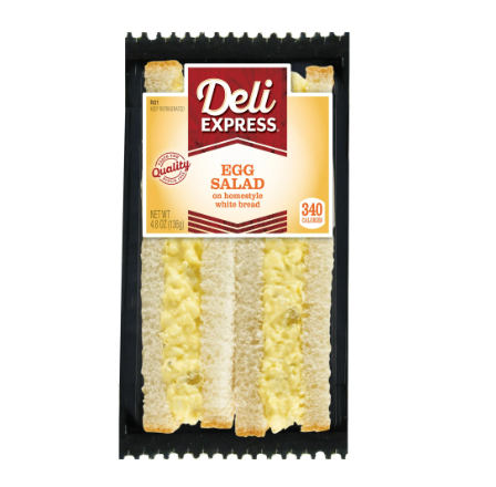 Deli Express Egg Salad Sandwich Wedge is made with real eggs, served on soft white bread. Perfect for a quick snack or meal, this deli sandwich is made with quality ingredients. This Ready-to-Eat sandwich is sealed in air-tight packaging to maintain it's fresh taste. Contains Egg, Milk, Sesame, Soy, Wheat Allergens.
