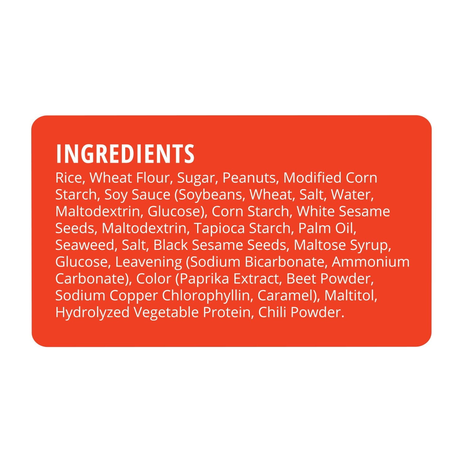 Ingredients: wheat flour, sugar, peanuts, modified corn starch, soy sauce, corn starch, white sesame seeds, maltodextrin, tapioca starch, pam oil, seaweed, salt, black sesame seeds, maltose syrup, glucose, leavening, color, maltitol, hydrolyzed vegetable protein, chili powder. Contains wheat, soybeans, peanuts, sesame. may also contain milk, tree nuts, egg, fish, crustacean shellfish, and sulfites.