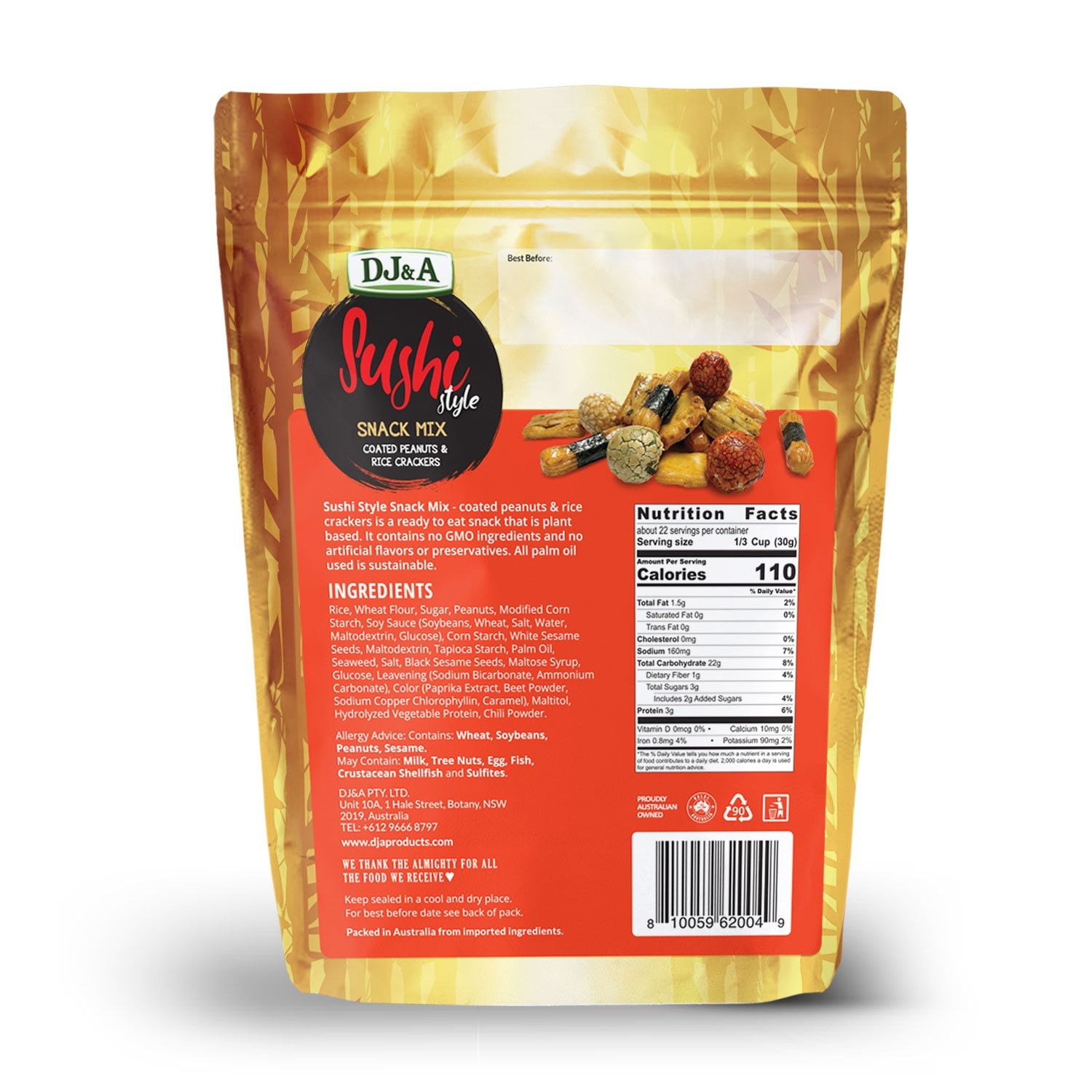 DJ&A Sushi Style Snack Mix is vegan-friendly, plant-based, and free from genetically modified ingredients, artificial flavors, colors, and preservatives. Made with sustainable palm oil, this snack aligns with ethical and environmental values. Additionally, it meets Kosher and Halal dietary requirements, making it suitable for diverse preferences.