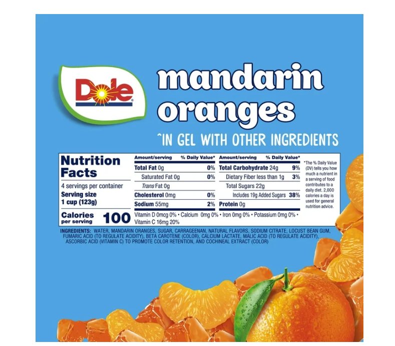 Water, Mandarin Oranges, Sugar, Carrageenan, Natural Flavors, Sodium Citrate, Locust Bean Gum, Fumaric Acid (to Regulate Acidity), Beta Carotene (Color), Calcium Lactate, Malic Acid (to Regulate Acidity), Ascorbic Acid (Vitamin C) to Promote Color Retention, Cochineal Extract (Color)