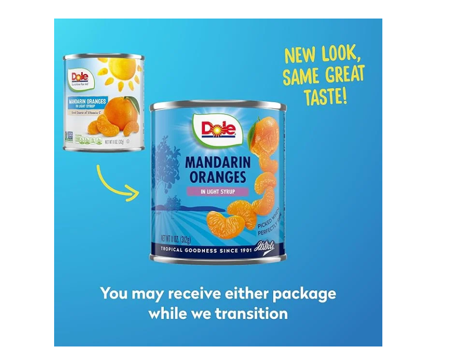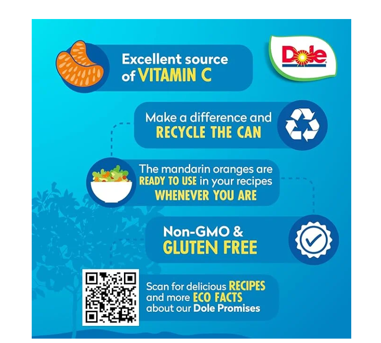 Juicy mandarin orange slices in light syrup! Dole Mandarin Oranges are packed in an easy-to-open can, keeping the mandarin orange slices fresh and ready to be enjoyed at any time. Rich in Vitamin C, Dole Mandarin Oranges in Light Syrup are made with the nutritional goodness of real fruit, making them the ideal snack for breakfast, lunch, dinner, or anytime you're craving a sweet treat. Dole Mandarin Oranges are great by themselves, as a topping, or in fruit salads, smoothies, or homemade desserts. With Dole's shelf-stable products, you can have the delicious taste of refreshing fruit anywhere, anytime.