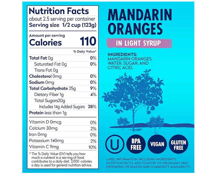 Mandarin Oranges, Water, Sugar and Citric Acid.