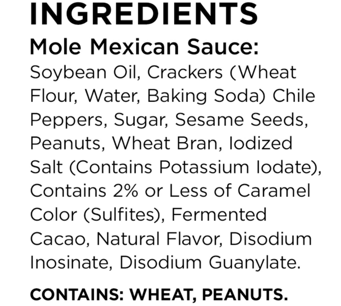 Soybean Oil, Crackers (Wheat Flour, Water, Baking Soda), Chile Peppers, Sugar, Sesame Seeds, Peanuts, Wheat Bran, Iodized Salt (Contains Potassium Iodate), Contains 2% Or Less Of: Caramel Color (Sulfites), Fermented Cacao, Natural Flavor, Disodium Inosinate, Disodium Guanylate.