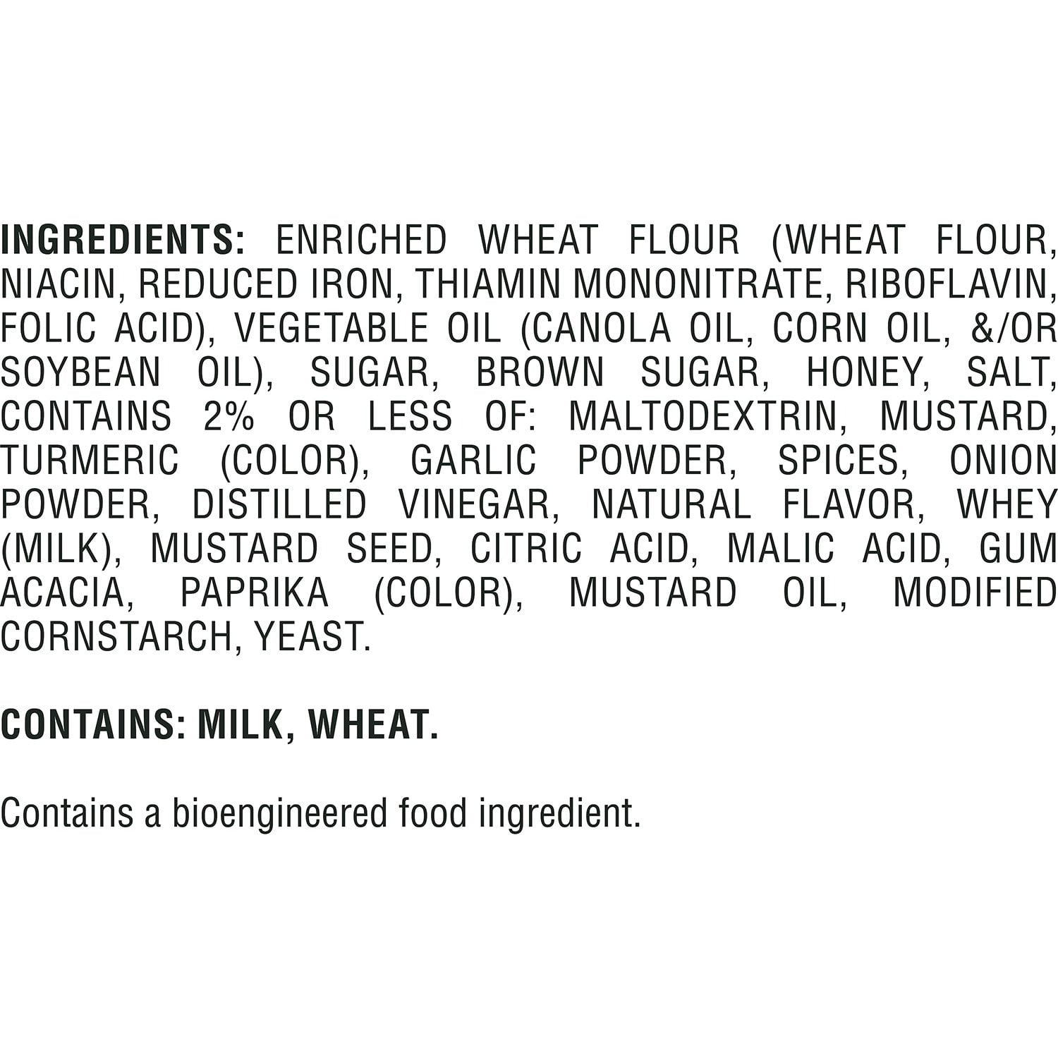 Ingredients: Enriched Wheat Flour (Wheat Flour, Niacin, Reduced Iron, Thiamin Mononitrate, Riboflavin, Folic Acid), Vegetable Oil (Canola Oil, Corn Oil, &/Or Soybean Oil), Sugar, Brown Sugar, Honey, Salt, Contains 2% Or Less Of: Maltodextrin, Mustard, Turmeric (Color), Garlic Powder, Spices, Onion Powder, Distilled Vinegar, Natural Flavor, Whey (Milk), Mustard Seed, Citric Acid, Malic Acid, Gum Acacia, Paprika (Color), Mustard Oil, Modified Cornstarch, Yeast. Contains: Milk, Wheat.