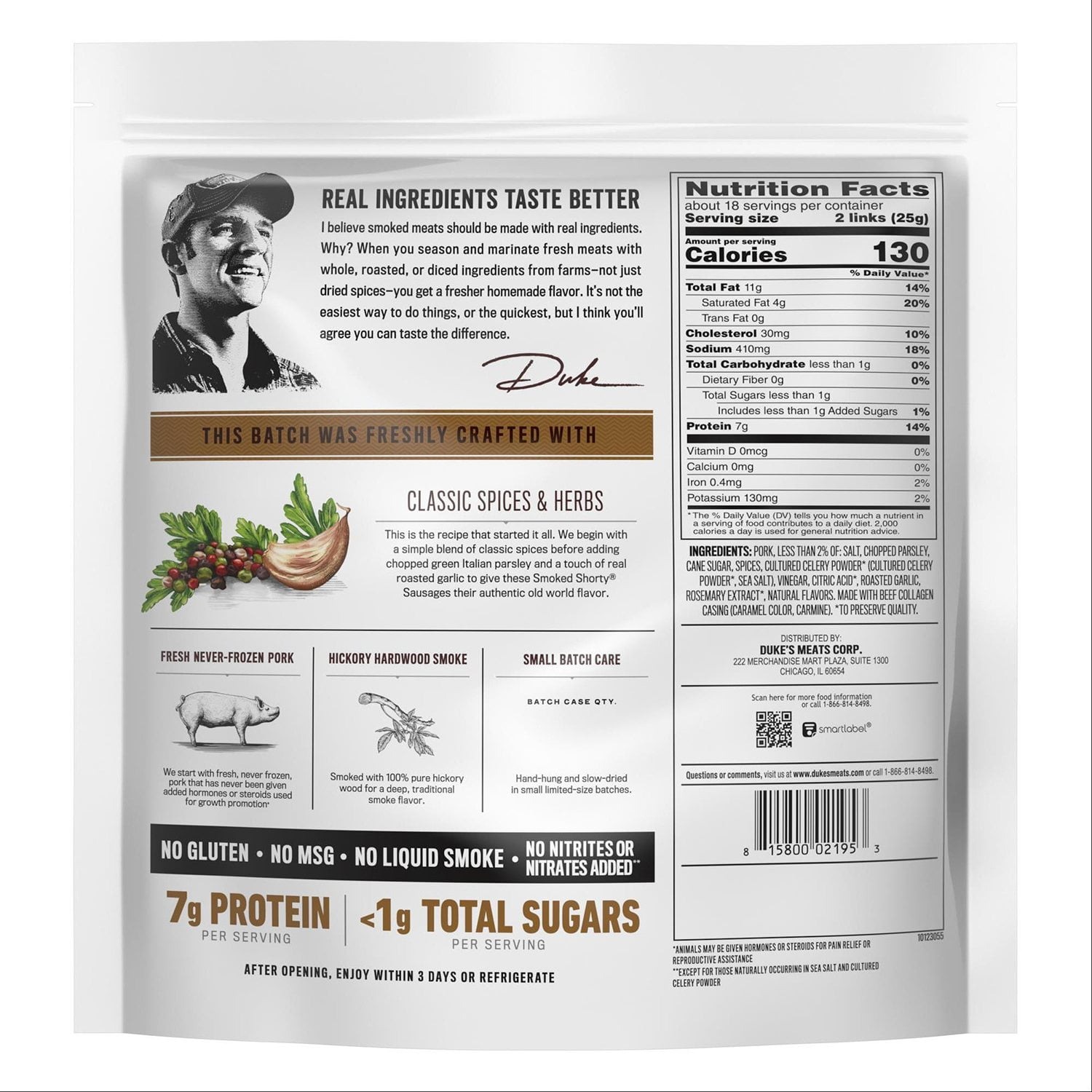 Duke's Original Recipe Smoked Shorty Sausages are crafted with classic spices and herbs. Duke's smoked sausages are made with real ingredients and a simple blend of classic spices, before adding chopped, green Italian parsley and a pinch of real, roasted garlic to give Duke's shorty sausages an authentic, old-world flavor.