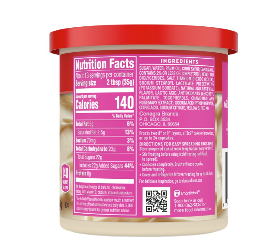Duncan Hines Creamy Cream Cheese Frosting makes it easy to whip up irresistible treats. Its rich, creamy flavor satisfies your cream cheese cravings. Perfect for any occasion, this frosting pairs well with chocolate, vanilla or fruit flavored desserts. Use as a carrot cake, red velvet cake or chocolate cake frosting, strawberry cupcake frosting or dessert topping. This can of cream cheese frosting is enough to frost two 8 or 9 inch cake layers, a 13 x 9 inch cake or up to 24 cupcakes. Keep with your baking and cake decorating supplies for any cookie decorating or cake decorating needs. Store the unopened can at room temperature and stir before use. Cover and refrigerate remaining frosting for up to 30 days. From whipped frosting, to single serve desserts, Duncan Hines has you covered when you're ready to bake and create. Life is as sweet as you make it!